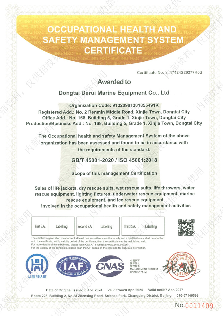 职业健康安全管理体系认证证书