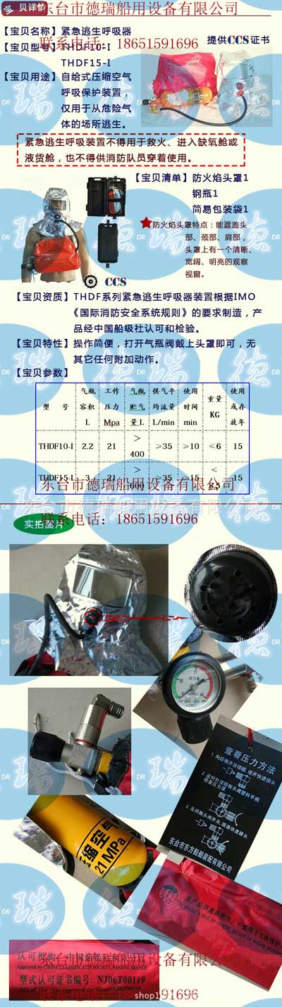 THDF10-I型、THDF15-I型紧急逃生呼吸器(EEBD)是根据国际海事组织MSC.98(73)决议通过的,于2002年7月1日成为强制型要求的《国际消防安全系统规则》设计制造的船用产品。本产品通过了CCS认证,有船检证书。